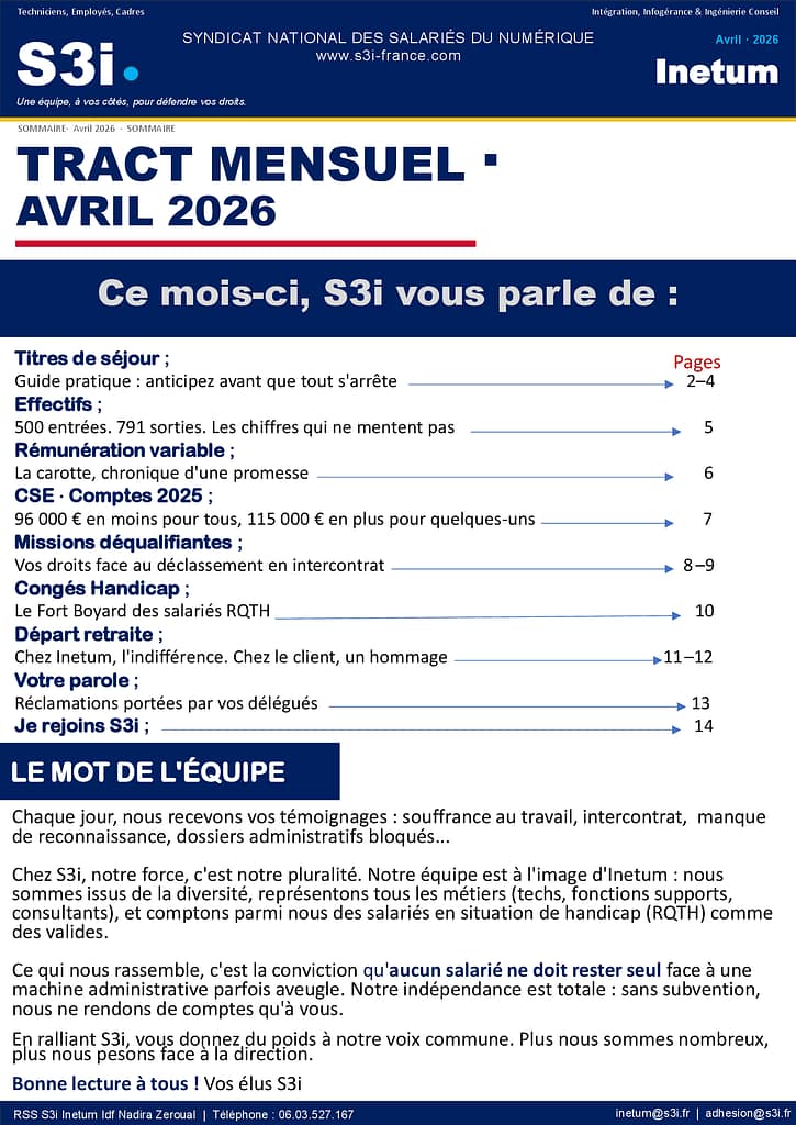 Communications 2026 INETUM La Newsletter Mensuelle S3i pour les salariés INETUM – Avril 2026 5 heures il y a Télécharger la communication syndicale mensuelle S3i INETUM – Avril 2026 Navigation d’article Précédent : Information Syndicale et des élu(e)s au CSE Sopra Steria I2S et SSG – Avril 2026 Beaucoup plus Communications 2026 INETUM La Newsletter Mensuelle S3i pour les salariés INETUM – Mars 2026 1 mois il y a Communications 2026 INETUM La Newsletter Mensuelle S3i pour les salariés INETUM – Février 2026 2 mois il y a Communications 2026 INETUM INETUM : Entre le discours et la Réalité 3 mois il y a Laisser un commentaireVotre adresse e-mail ne sera pas publiée. Les champs obligatoires sont indiqués avec *Commentaire * Nom E-mail Site web
