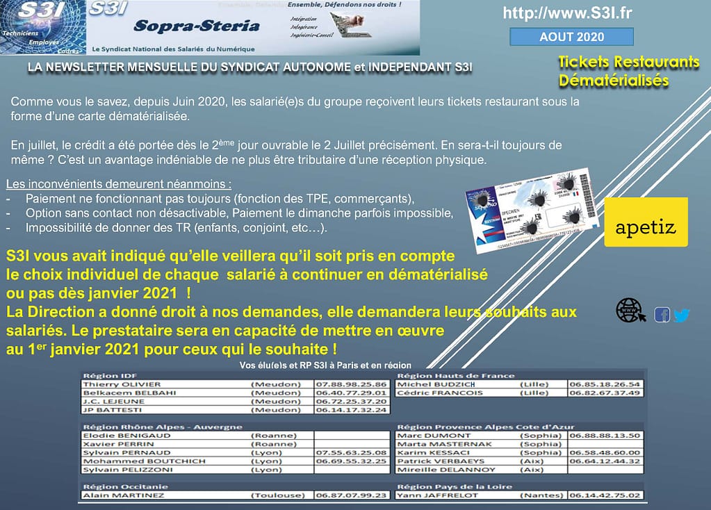 des élu(e)s au CSE I2S et SSG pour le mois d’Août 2020.